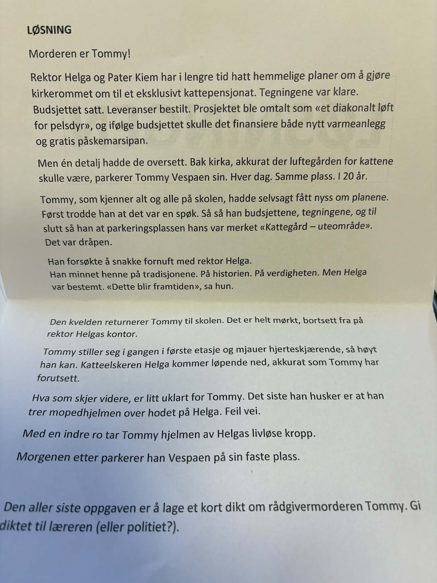 Hva skjedde med Helga? Første dag etter påskeferien møtte elevene på ungdomsskolen et åsted! Noen hadde drept Helga, og det var opp til elevene å finne ut hvem morderen var. Gjennom en rekke matteoppgaver skulle elevene i grupper komme frem til et løsningsord som viste vei til morderen. Opplegget engasjerte mange og de fikk regne matte sammen og på ulike måter.